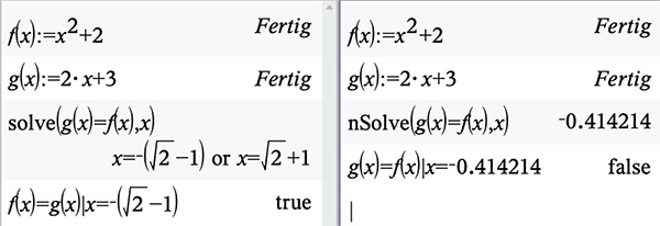 Ein graphischer Taschenrechner (GTR) arbeitet nur mit rationalen Näherungswerten, das CAS ist in der Lage, exakt zu arbeiten und hilft Fehler zu vermeiden (links CAS, rechts GTR).