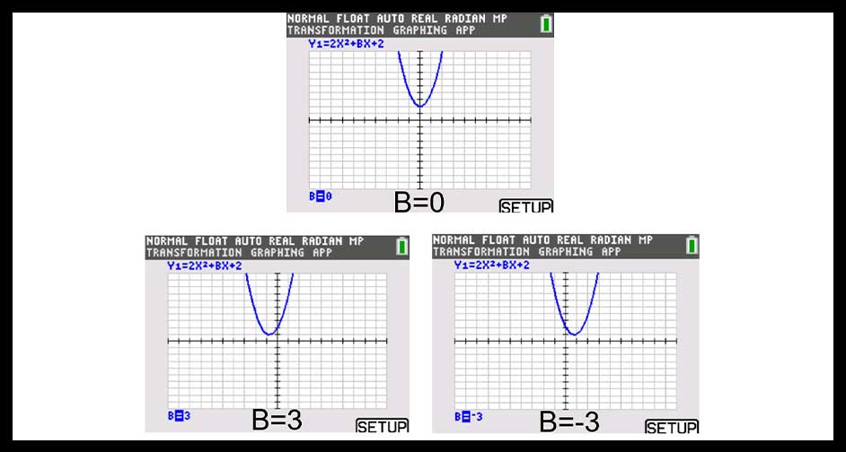 What I like students to discover is that the axis of symmetry will be on the y-axis whenever b=0. And, that the graph moves in a symmetrical fashion about the y-axis as the value of b changes. In fact, when B = 3, the graph when B = -3 is a reflection across the y-axis.