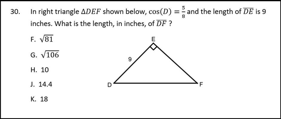 When students learn SohCahToa they are told that the “o” stands for opposite side, “a” for the adjacent side, and “h” for the hypotenuse. So, when students see cos(D) = 5/8, they immediately think that the adjacent side is 5, and the hypotenuse is length 8. This is a super-confusing problem for a couple of reasons. The adjacent side is already labeled 9, and none of the answer choices for the length of segment DF are 8? It boils down to students not understanding that sine, cosine and tangent are RATIOS. In other words, the numerator is not necessarily the length of the adjacent side when calculating the cosine, and so on.