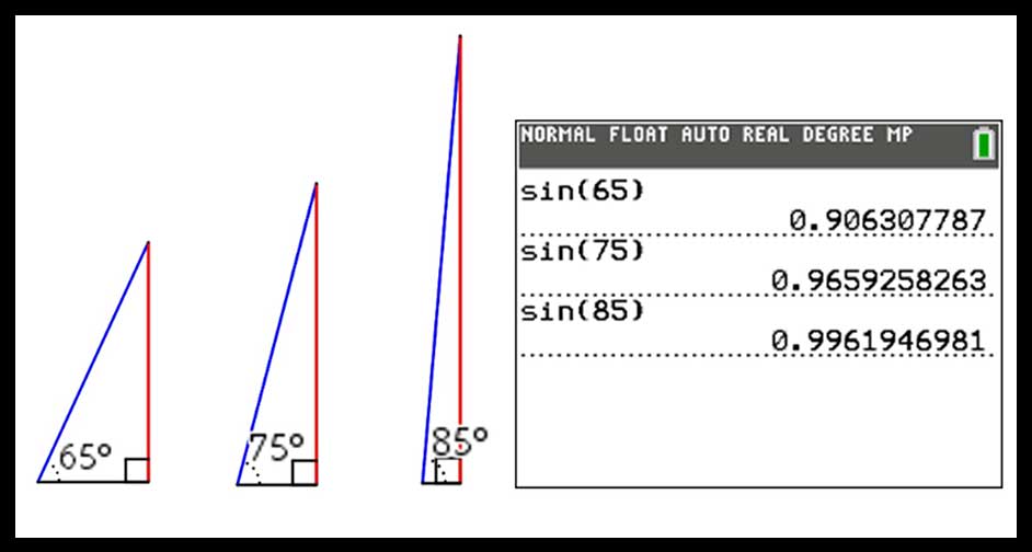 So, how could we introduce the concept of trig ratios so that the students get the concept? I like to use technology as an exploratory tool for students. Once students learn that sine is the ratio of the opposite side to the hypotenuse, show them the image below and have them use their TI-84 Plus CE to calculate the sine of the three angles (65°,75° and 85°). Ask them:
